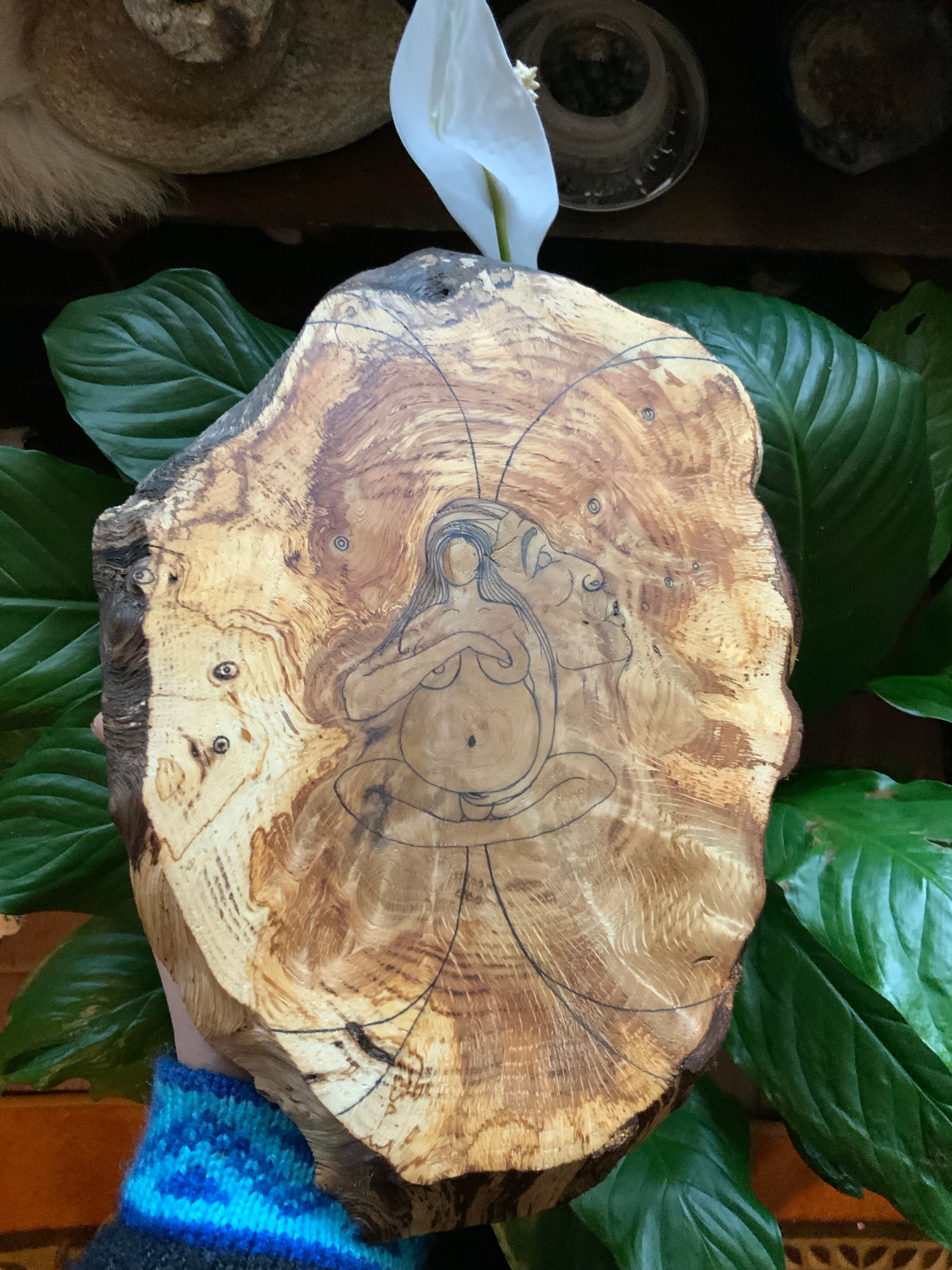 She expresses, and spreads her art through originals paintings, hand made burl/wood slabs, prints, digital designs, and apparel.